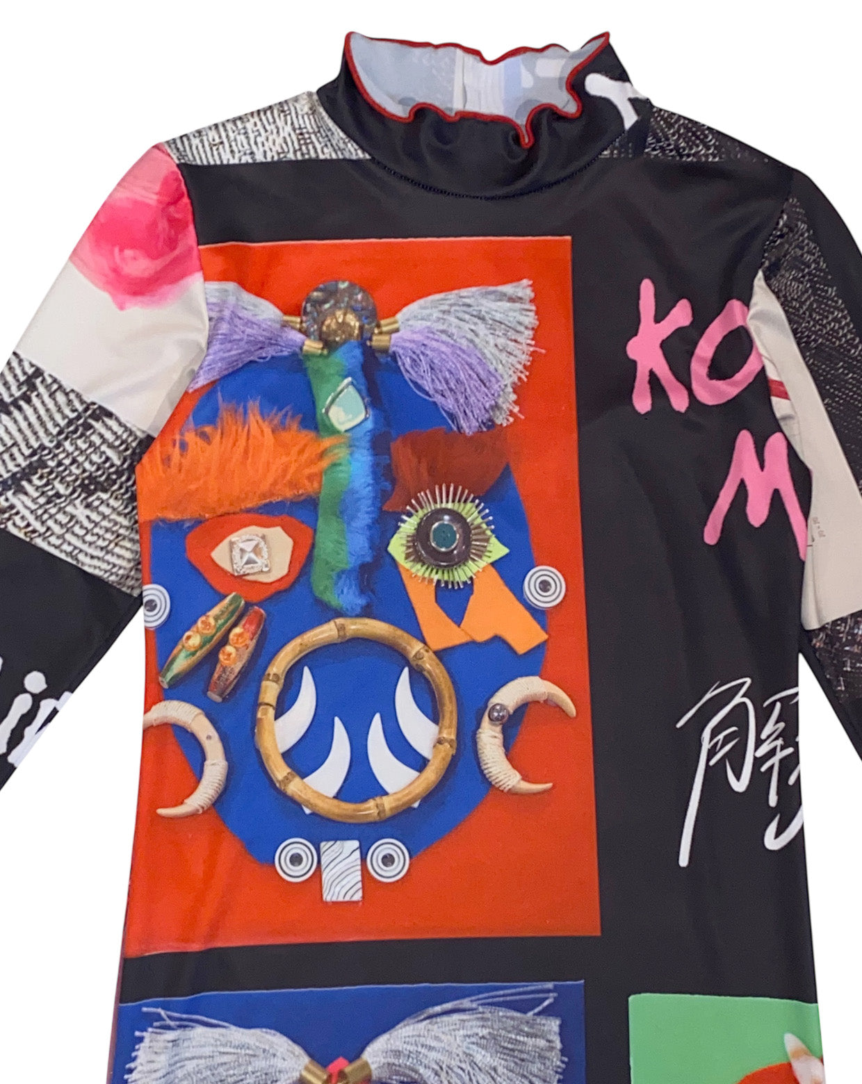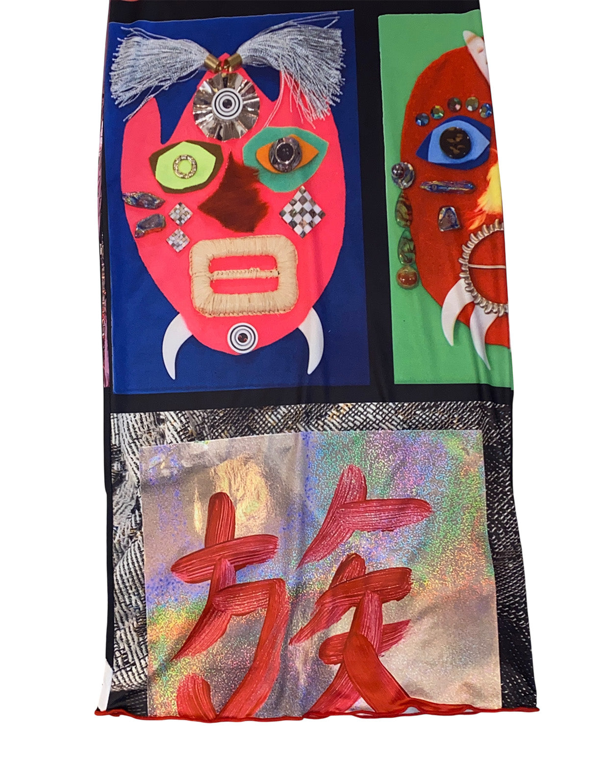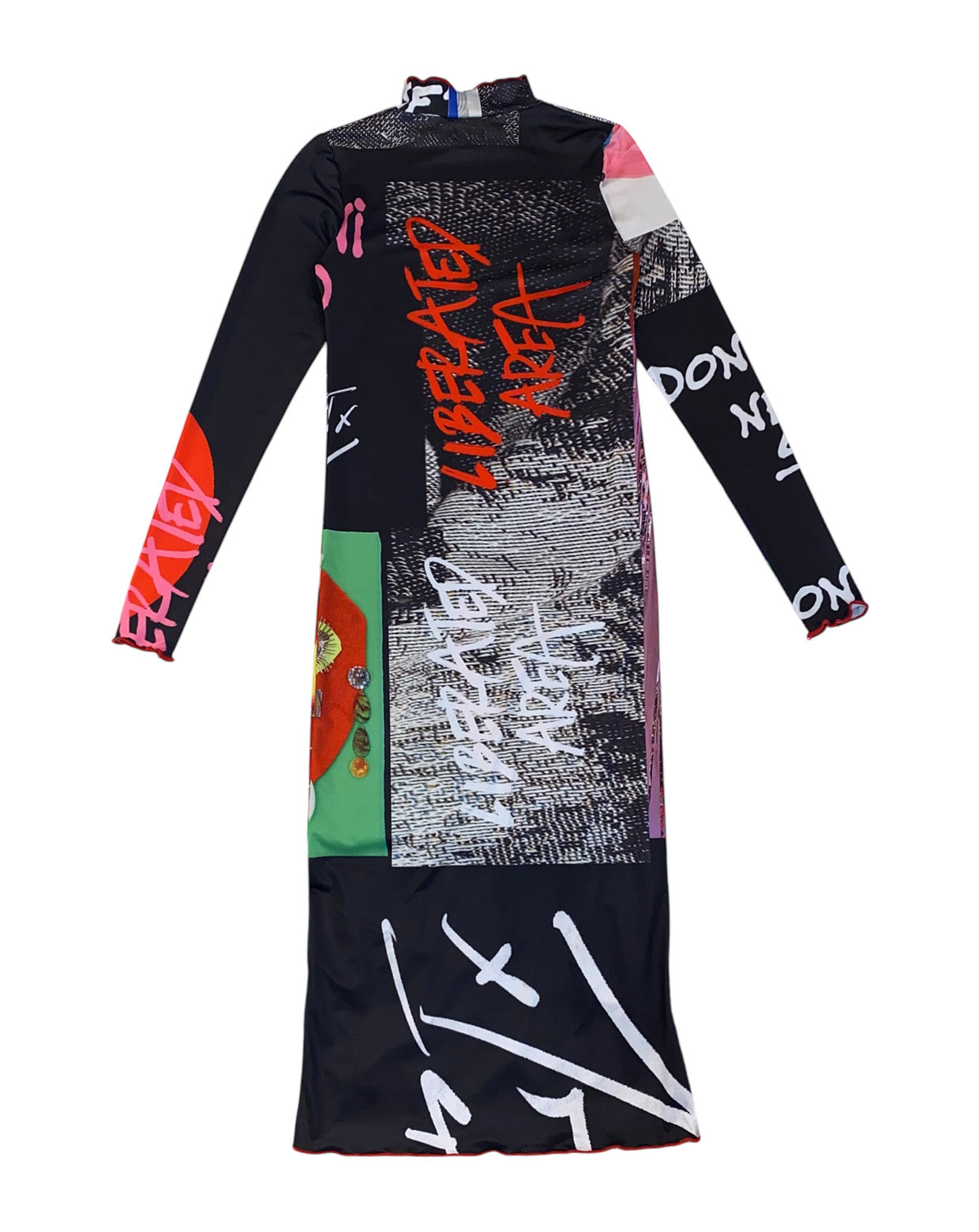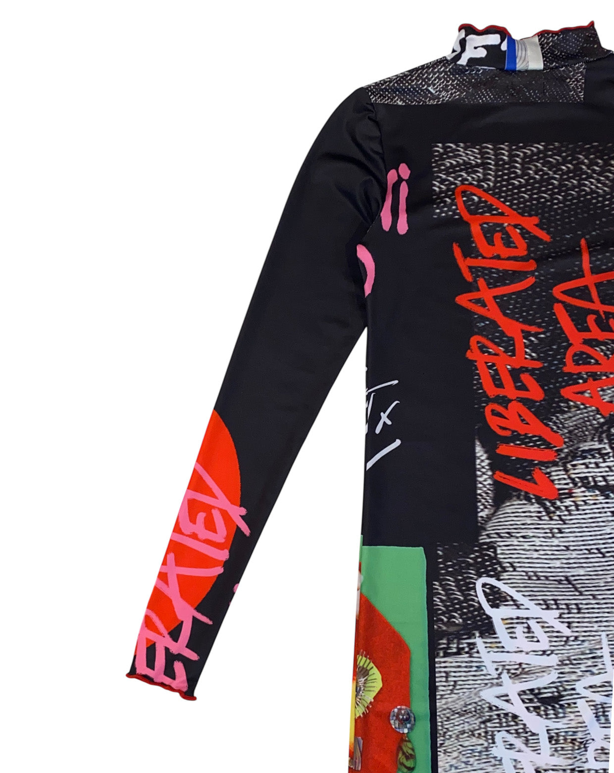 "解放地区” Liberated Areaをイメージして制作された文字やメッセージ、アートが全面に散りばめられた作品がプリントされた1枚。