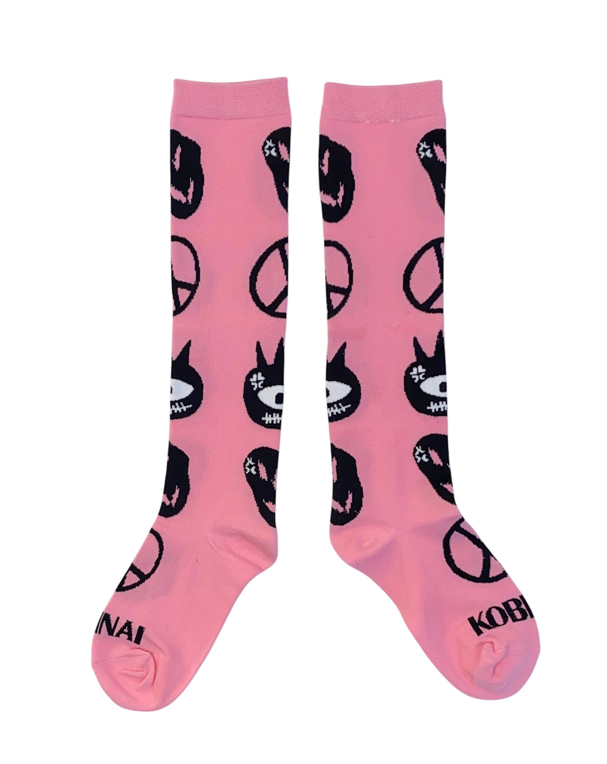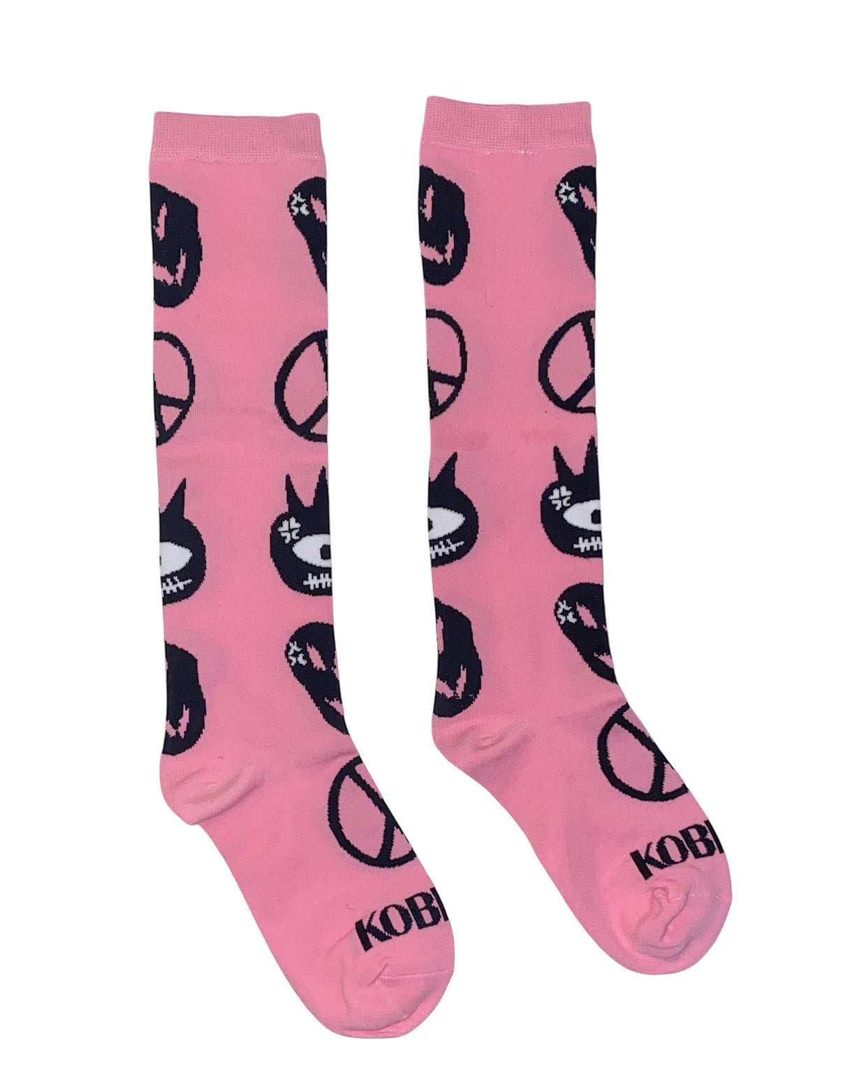 Socks woven with the image of the KOBINAI character's LOT of anger, the guardian deity of the door to dystopia, and the PEACE mark.