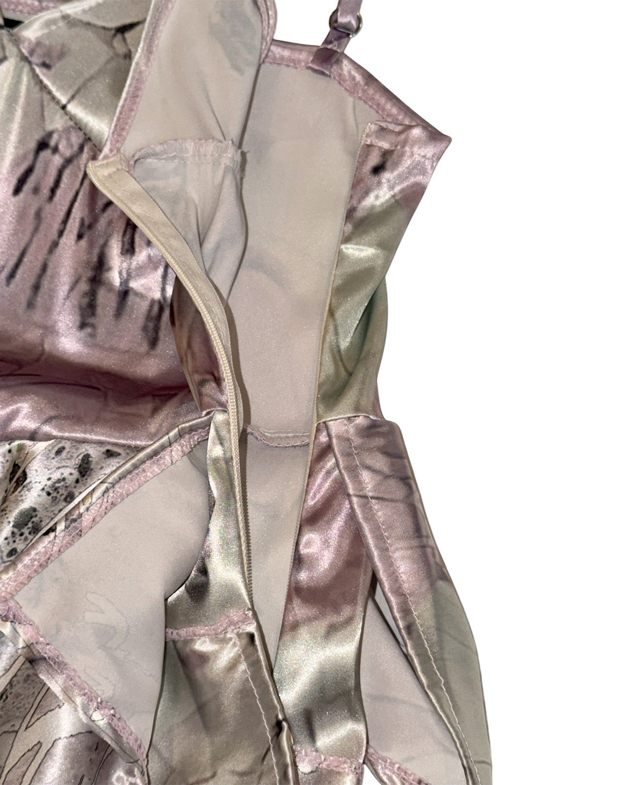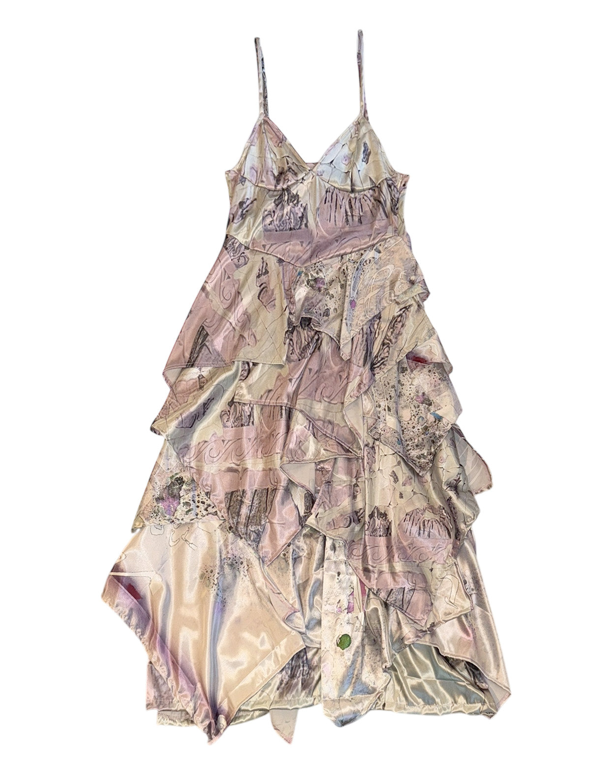 デザイナーMAIMIがヨーロッパを旅した時に撮影した街中とMAIMIのアートワーク、言葉を混ぜたグラフィックをプリントしたドレス。