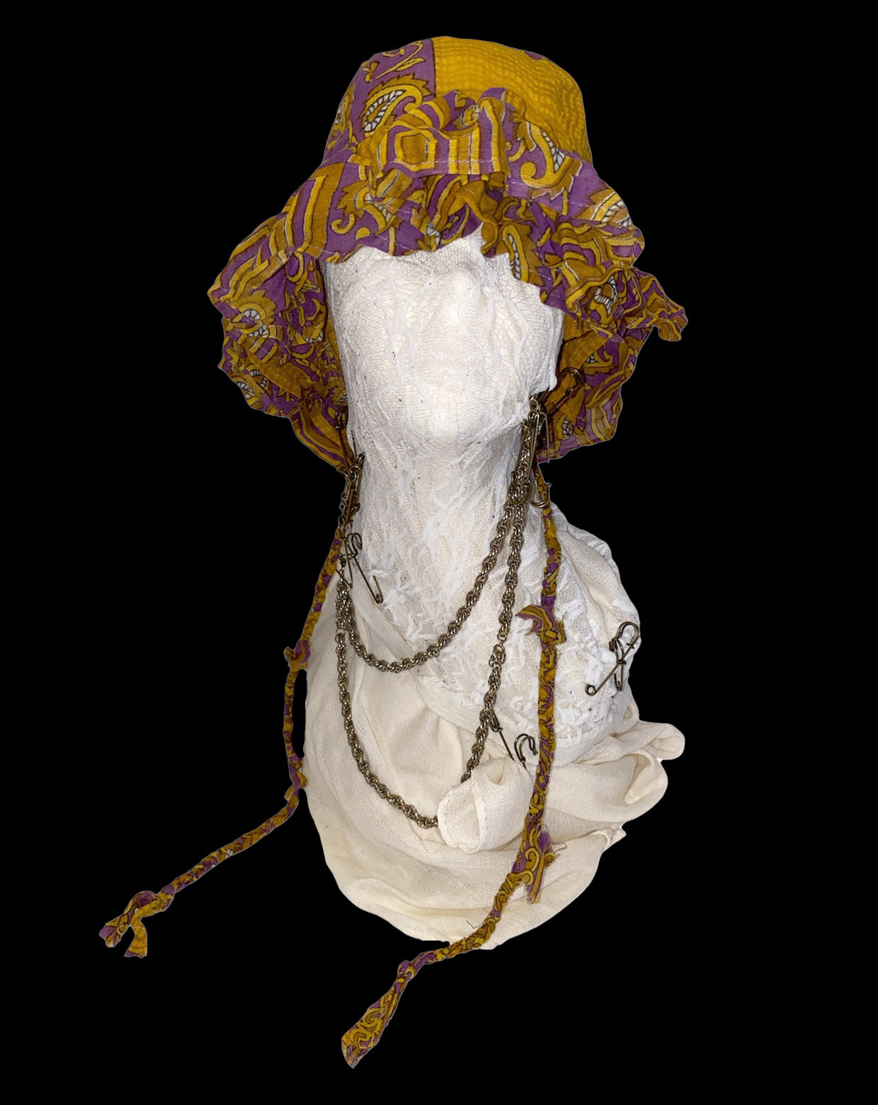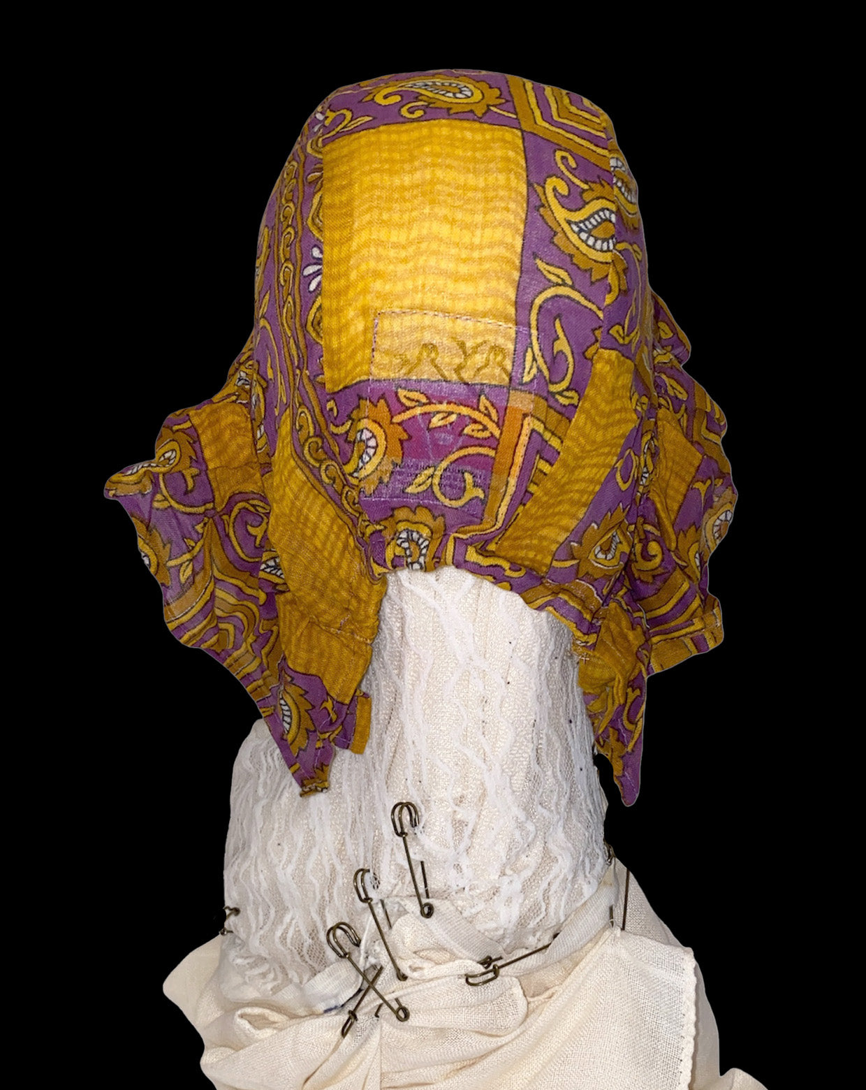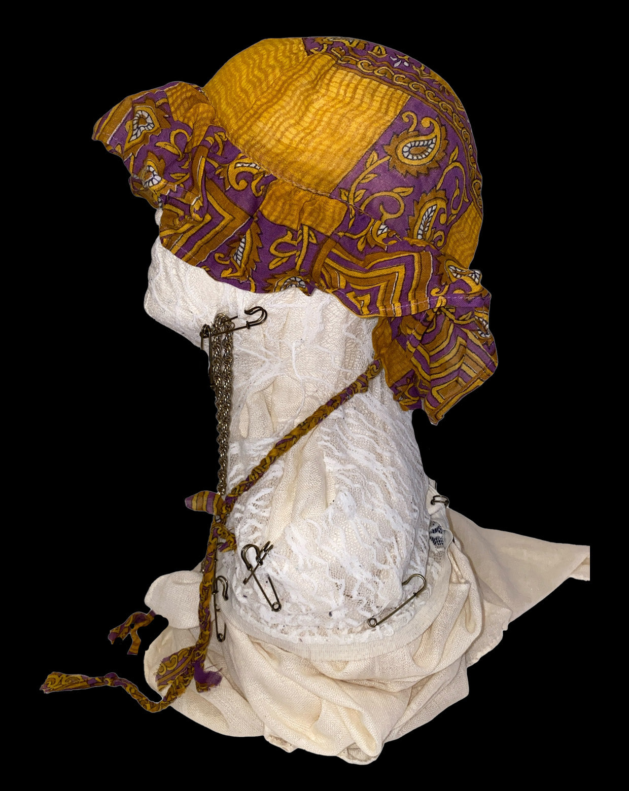 In response to this feeling, I created a hat designed using old saris purchased through fair trade.