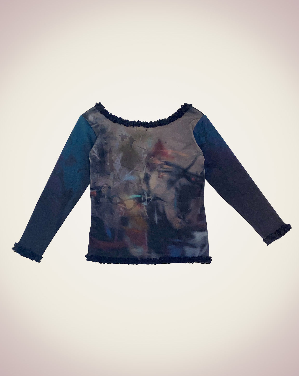 This top has ragged lace around the neck, hem, and cuffs.