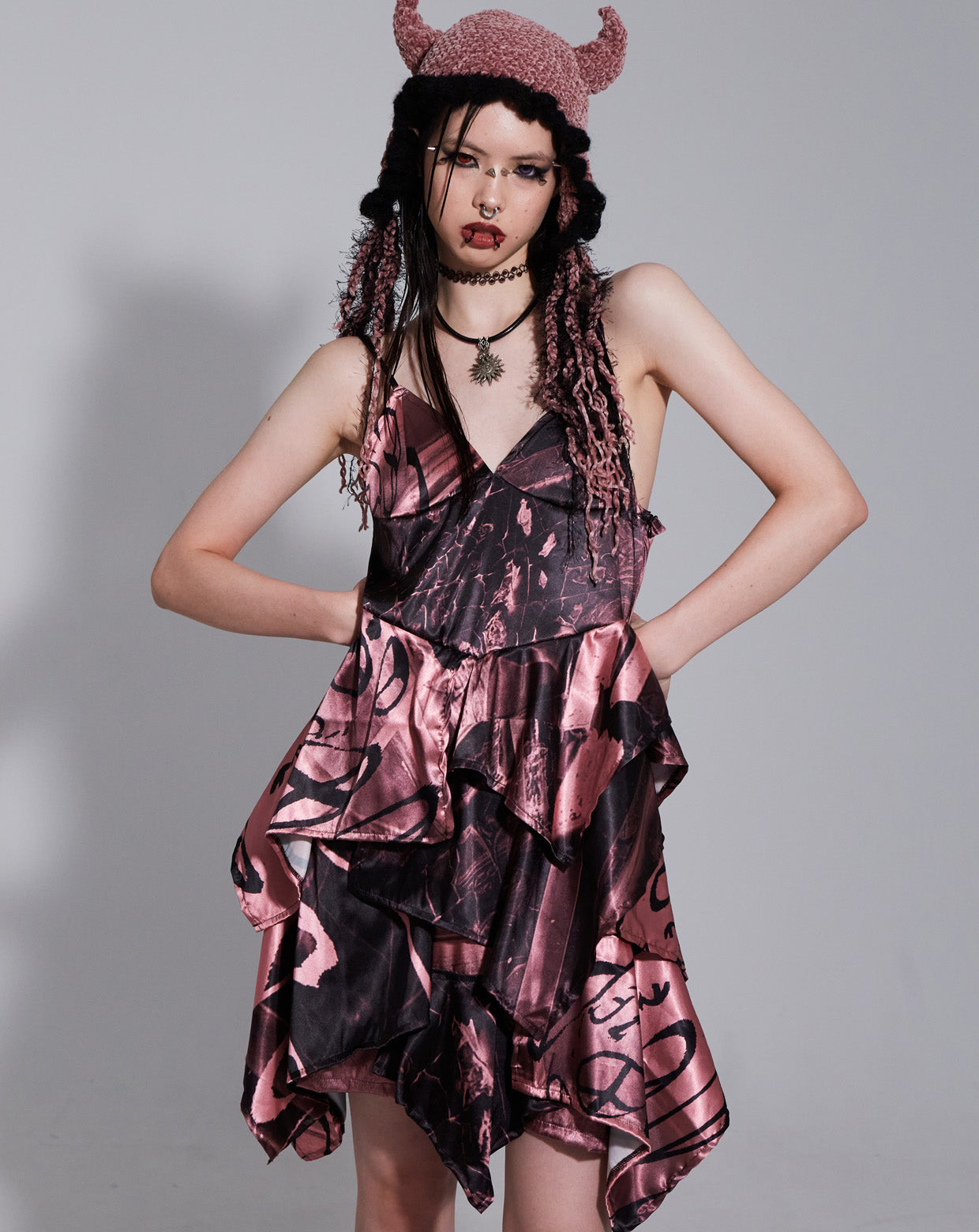 デザイナーMAIMIがヨーロッパを旅した時に撮影した街中とMAIMIのアートワーク、言葉を混ぜたグラフィックをプリントしたワンピース。