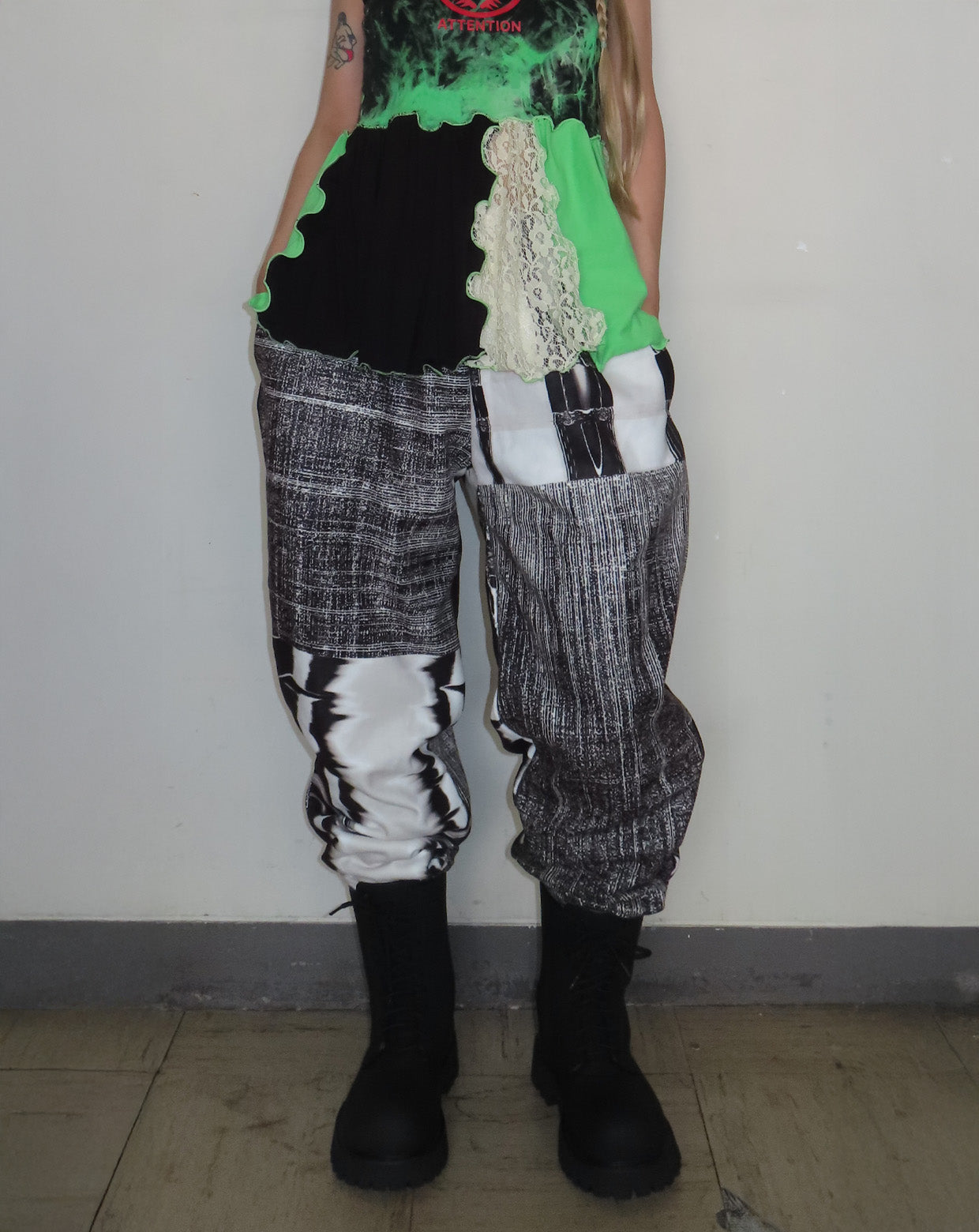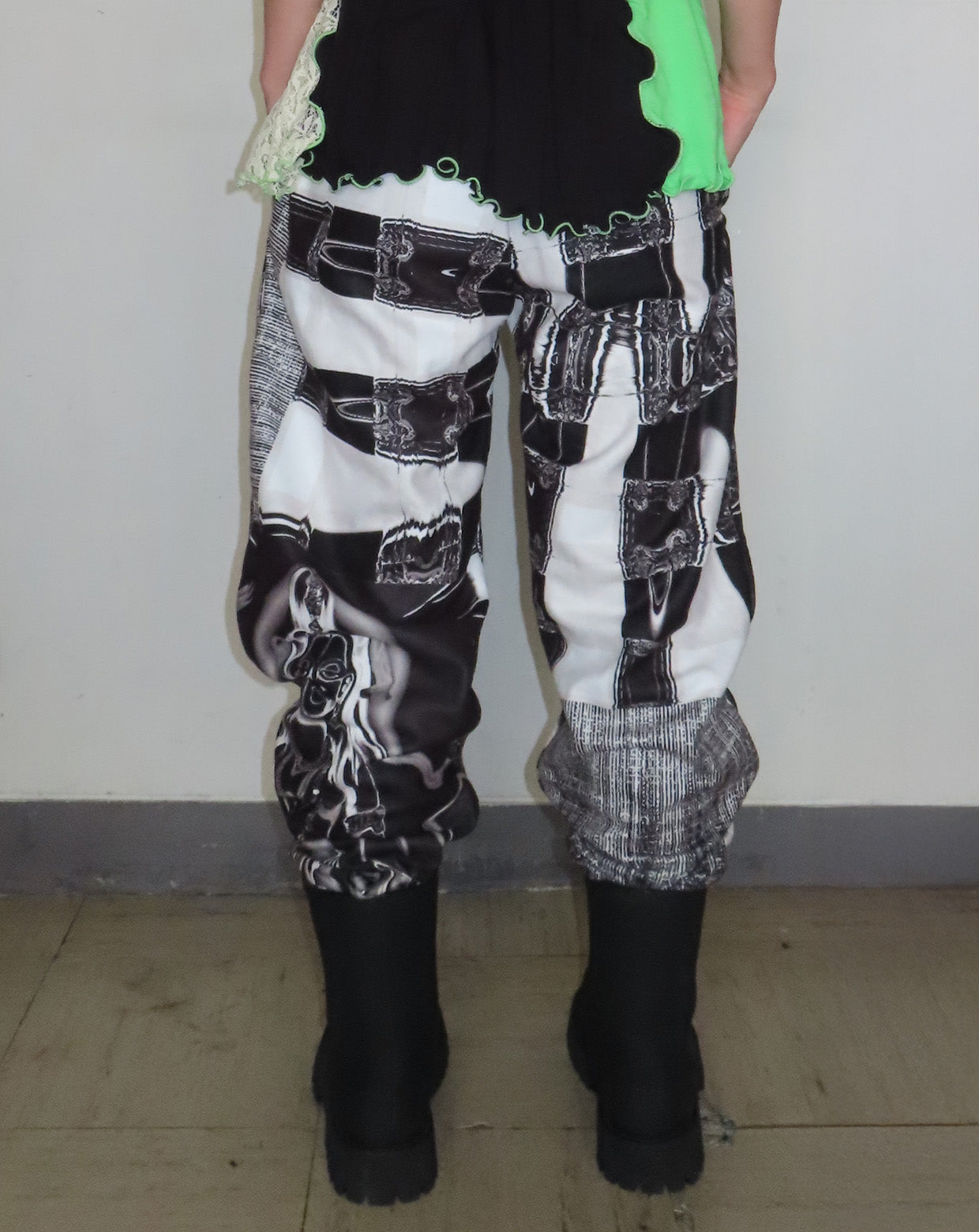 デザイナーMAIMIがヨーロッパを旅した時に感じた事を言葉とグラフィックにしてプリントしたフリースパンツ。