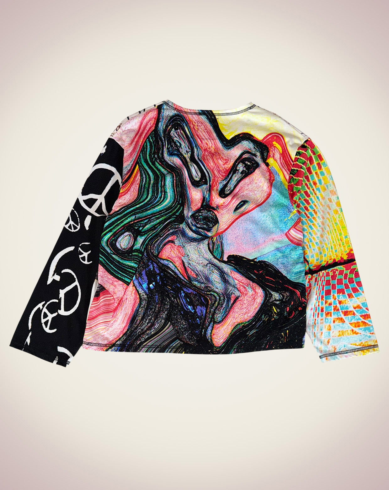 間違えて入稿し、制作を進め、出来上がったロングスリーブを見ると、ちょうど正面に割れた窓ガラスのヒビが広がり、今まさに平和を問うような1枚となった。